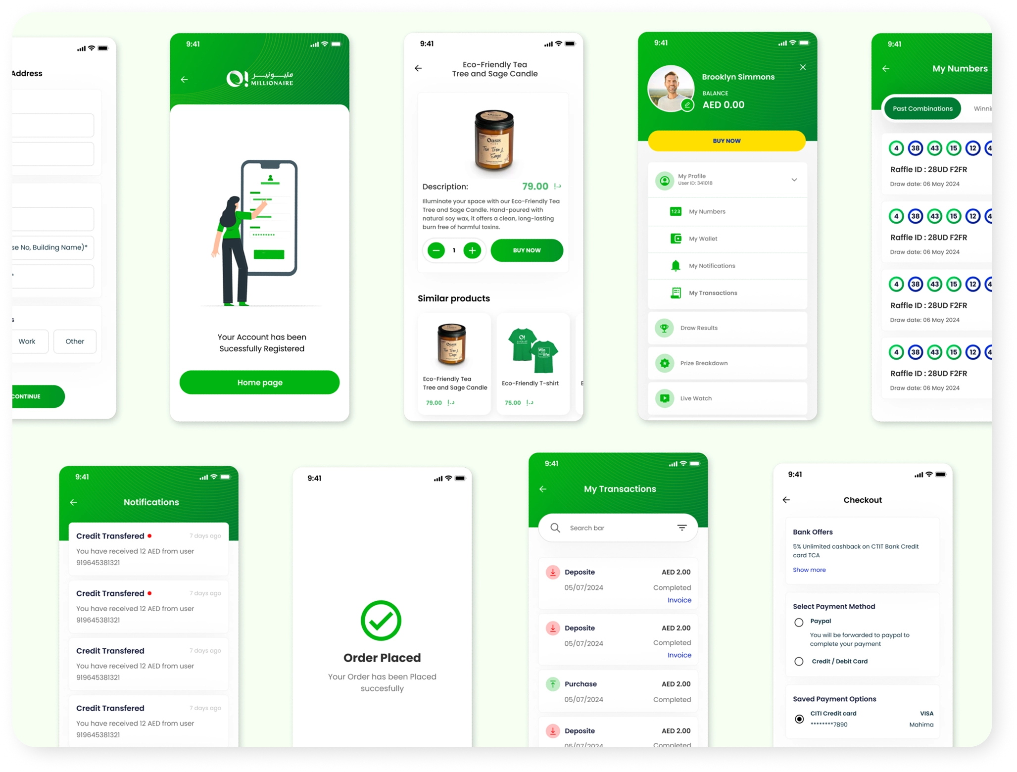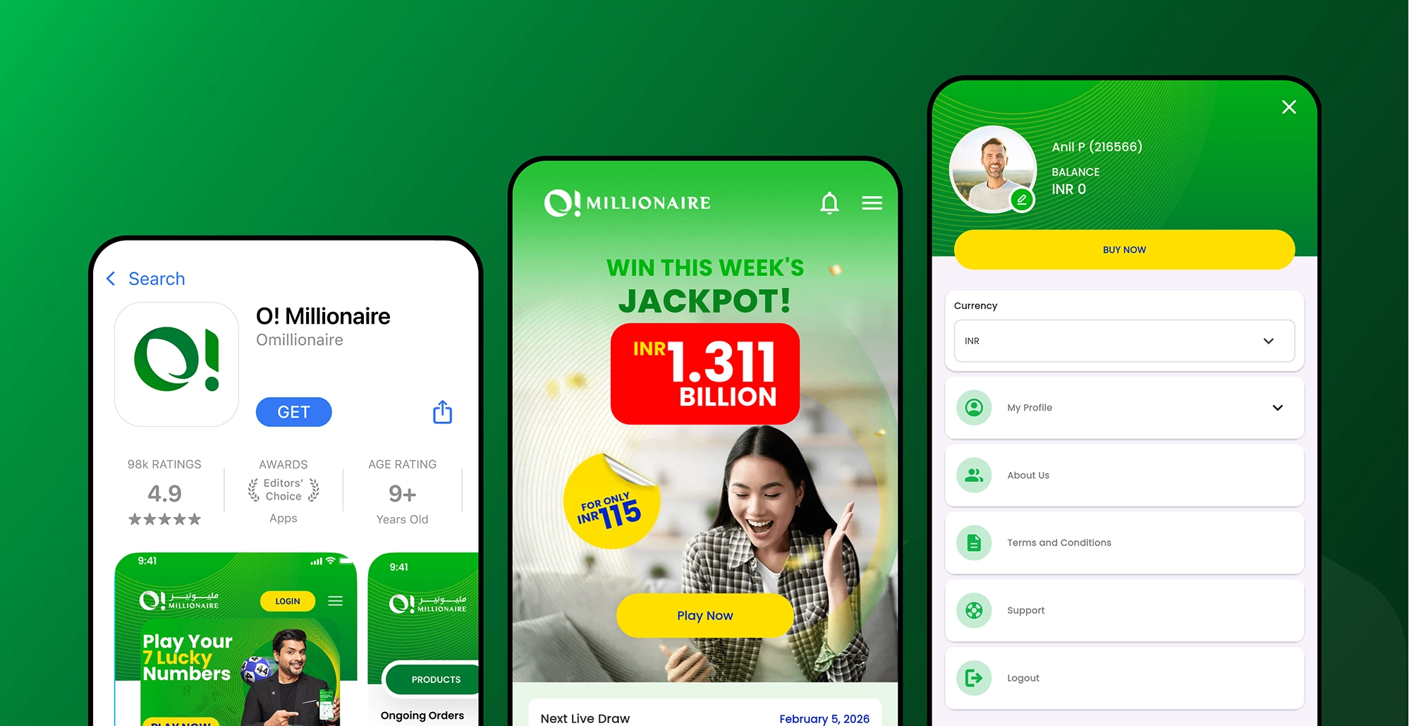 The UI focuses on reducing cognitive load while maximizing emotional engagement, easy number entry screens, bold call-to-action buttons for “Play Now,” and intuitive navigation. Visual cues around “Green Draw” and prize tiers help users instantly recognize value and stakes.